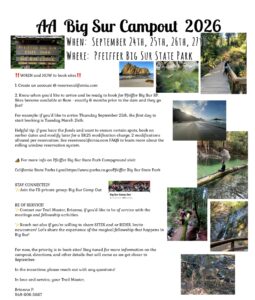 The AA Big Sur Campout 2026 will be held the weekend of September 24-27th at the Pfeiffer Big Sur Campground!