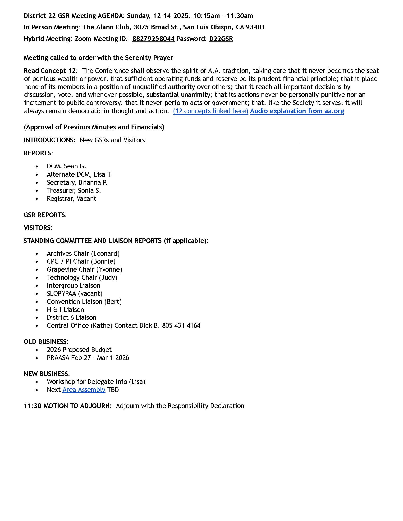 Hybrid District GSR meeting; monthly; in person at the SLO Alano Club and Zoom ID: 882 7925 8044 Passcode: D22GSR